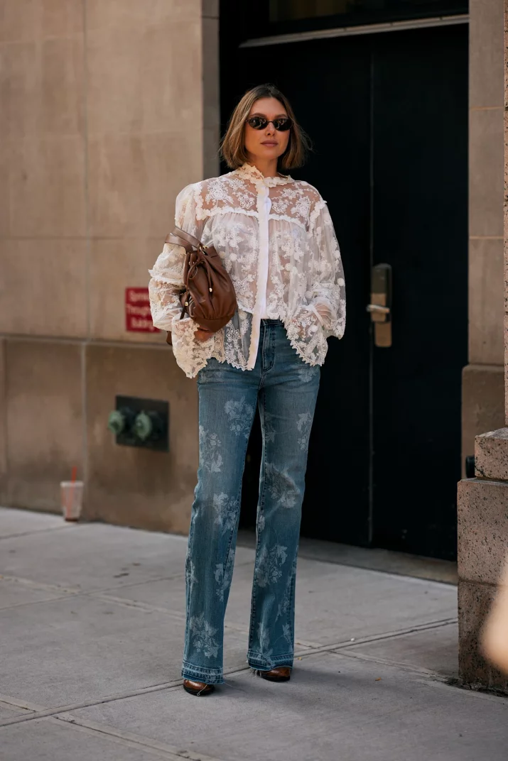 Najbardziej interesujący efekt powstaje wtedy, gdy proporcje pozostają wyważone. Zwiewna, objętościowa góra zestawiona z prostymi jeansami typu straight, klasycznym krojem flares z wysokim stanem i z dzwonami buduje nowoczesną sylwetkę. Denim działa jak wizualna rama: uspokaja stylizację i pozwala wybrzmieć detalom bez nadmiaru.