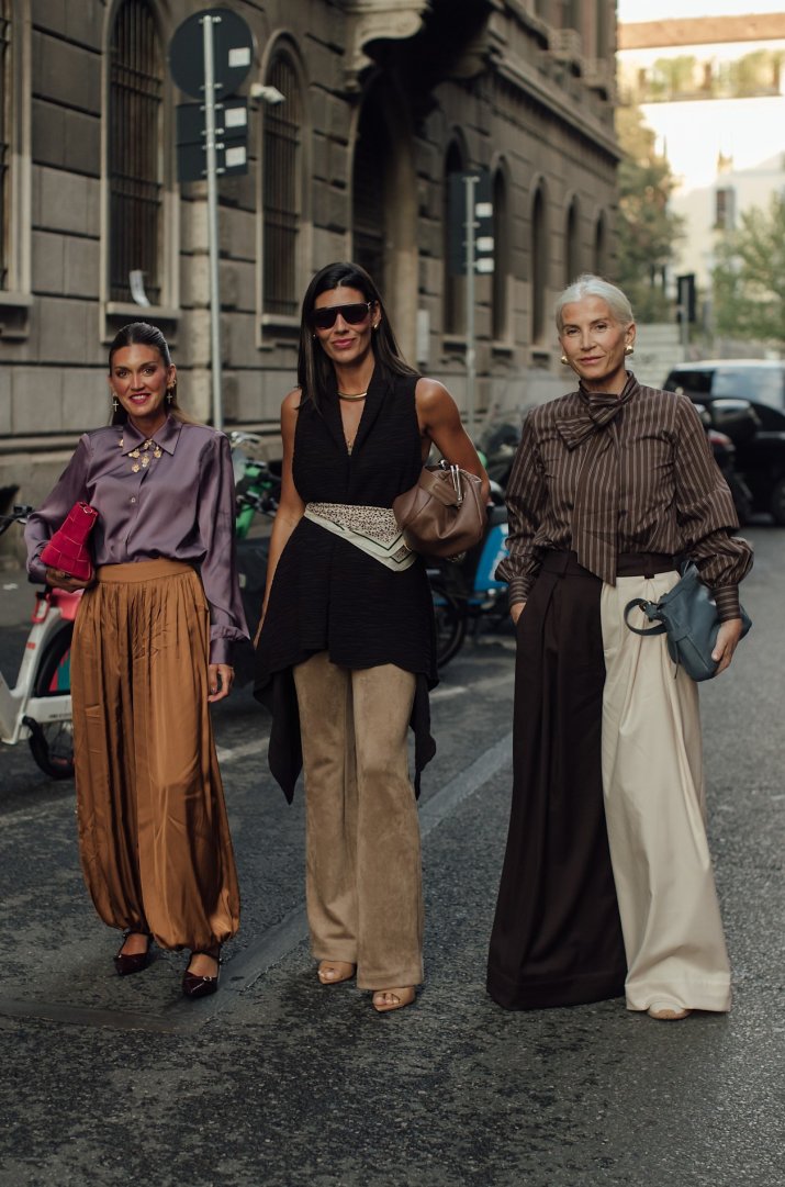 Obok płaszczy na ulicach Mediolanu często widać było również skórzane spódnice i spodnie. Spódnice sięgały za kolano lub do kostek i były łączone z lekkimi bluzkami, koszulami albo miękkimi swetrami. Spodnie miały prostą, szerszą nogawkę, co dodawało im eleganckiego luzu.