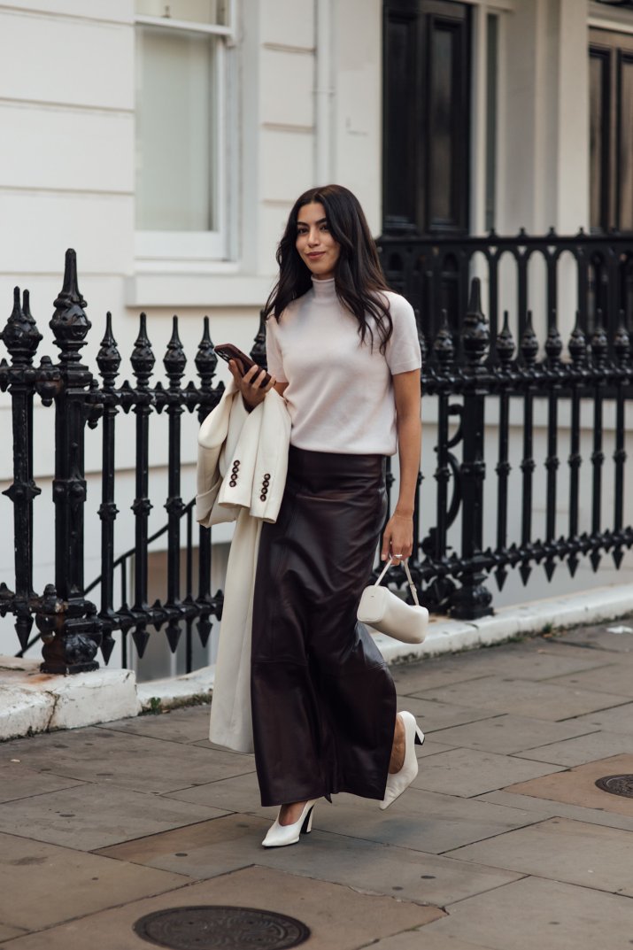 Uliczne stylizacje pokazują, że najlepiej sprawdza się prosty duet: skórzana spódnica i koszula. Biała czy błękitna, włożona do środka albo swobodnie wypuszczona, do tego czółenka lub minimalistyczne sandały. W chłodniejsze dni dobrze wygląda ze swetrem lub flanelową koszulą w kratę. Na mniej formalne wyjścia można połączyć ją z T-shirtem i oversize’ową marynarką, a wieczorem – z satynowym topem na ramiączkach z koronkowym wykończeniem albo dopasowanym body. Świetnie wypada też w total lookach.
