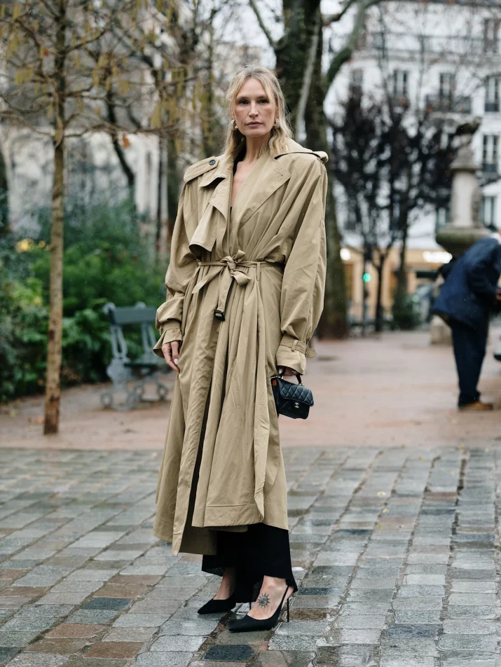 Współczesny trencz nie podkreśla sylwetki w klasyczny sposób, ale buduje ją poprzez proporcje. Szerokie ramiona nadają całości wyrazistości, a luźny fason wprowadza swobodę, redefiniując elegancję jako połączenie komfortu i charakterytycznego kroju inspirowanego stylem lat 80.