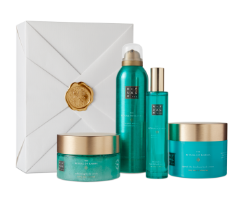 Zestaw Rituals do pielęgnacji ciała. Zestaw podarunkowy zawiera peeling do ciała, piankę pod prysznic w żelu, kem do ciała oraz mgiełkę do włosów i ciała. www.rituals.com